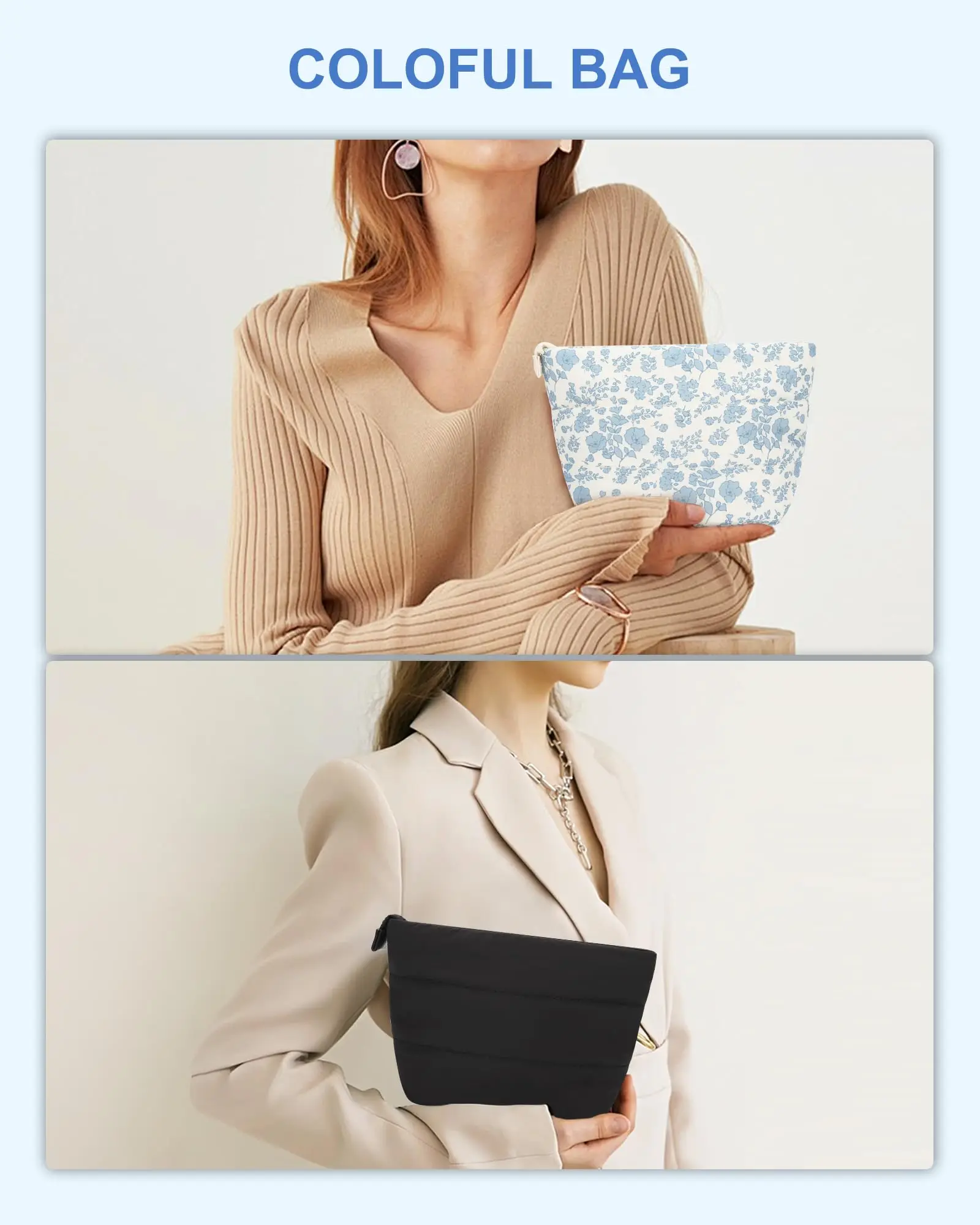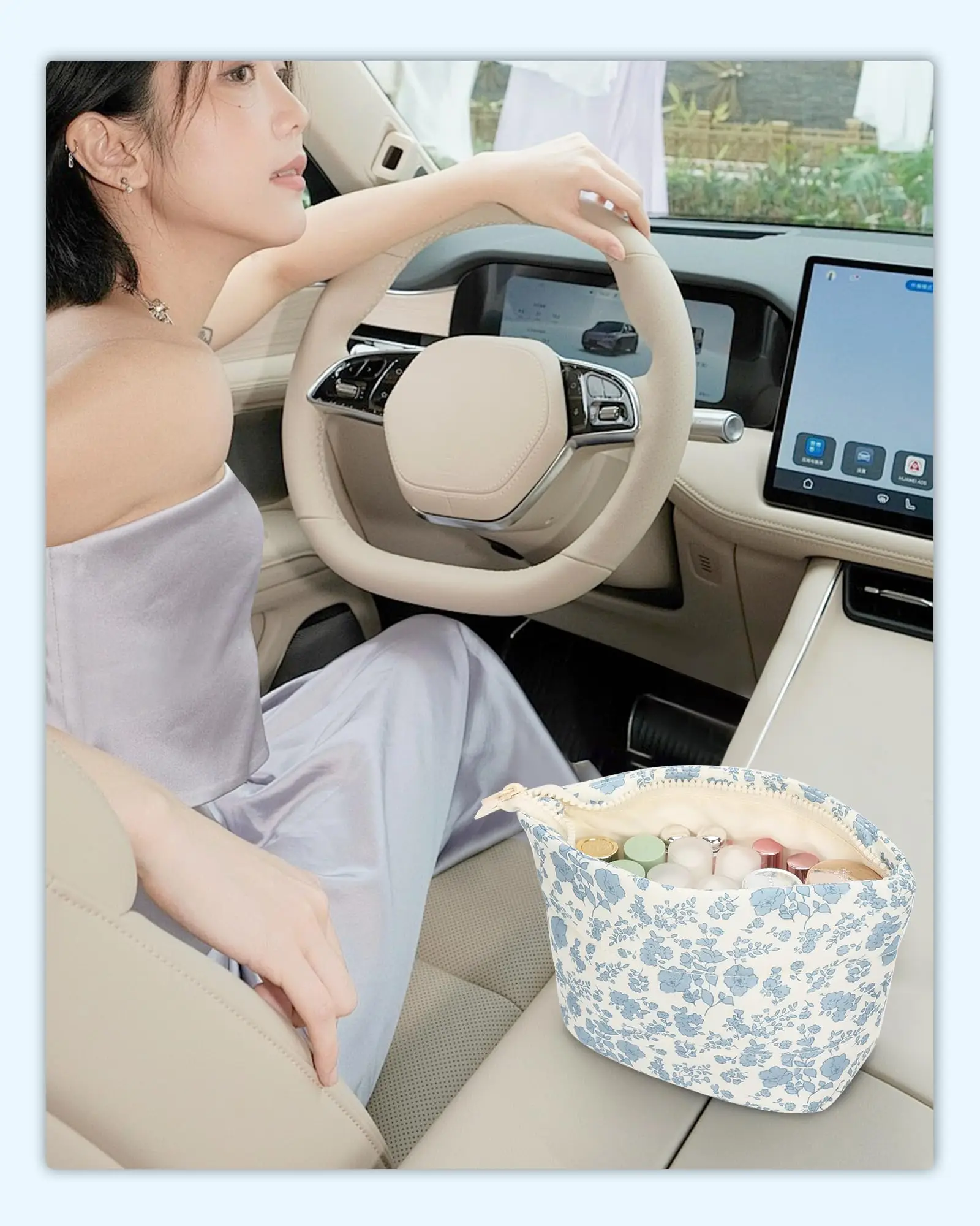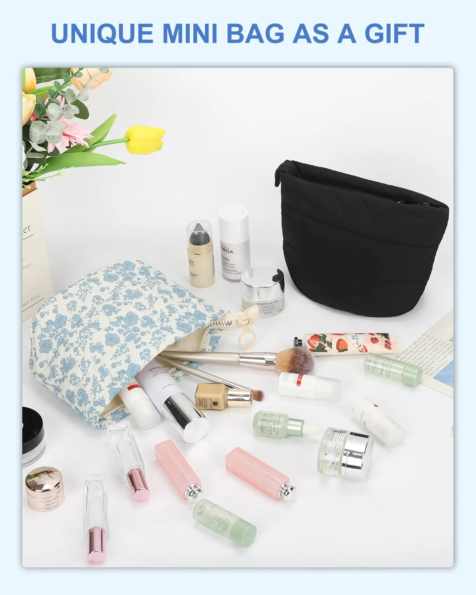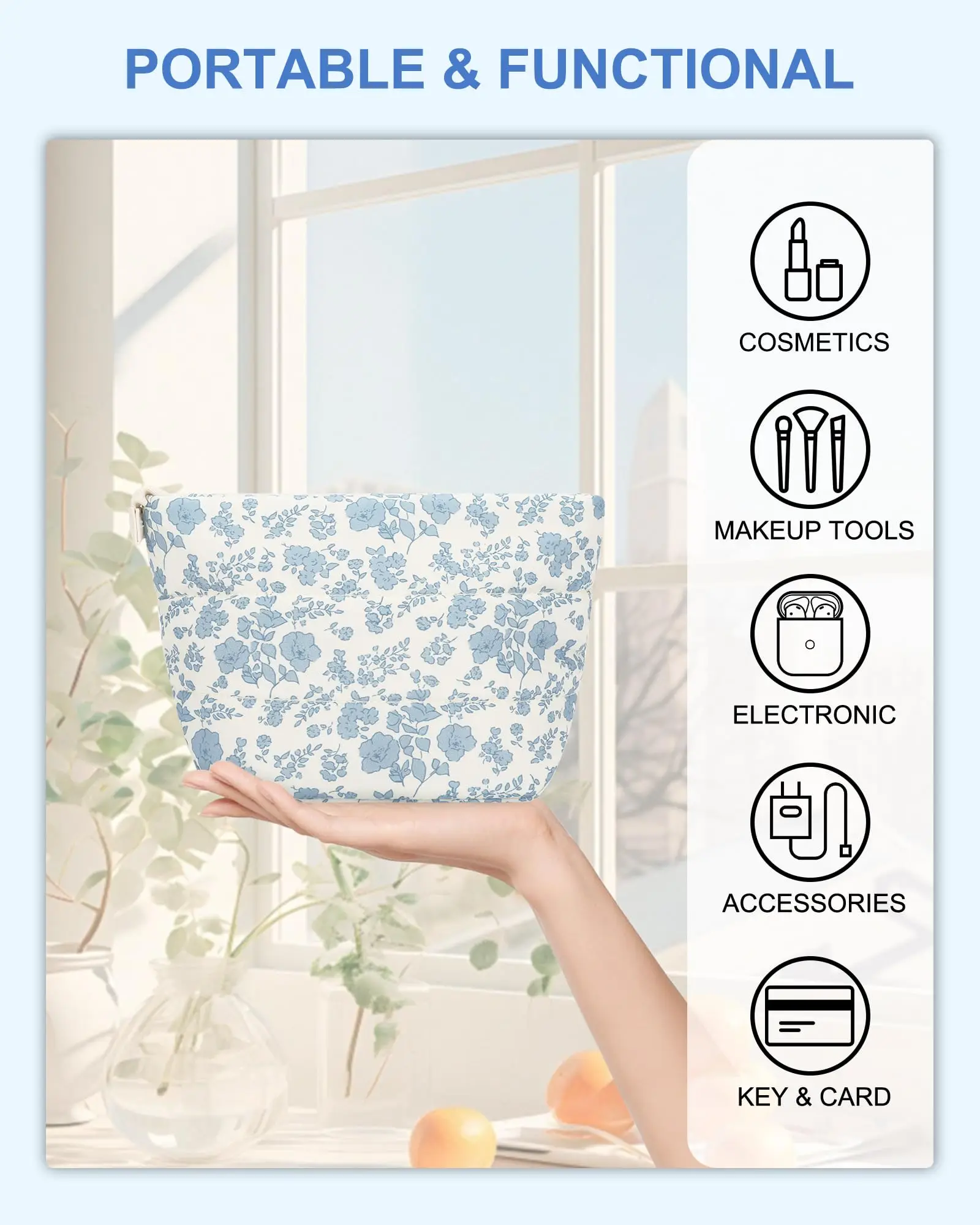 Large Quilted Travel Cosmetic Pouch Women Nylon Makeup Bag Zipper Closure Ladies’ Make Organizer Blue Little Flower Material